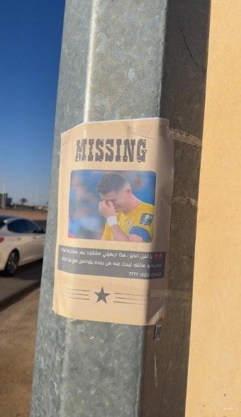 沙特街头出现了嘲讽C罗的“寻人启事”海报,海报上写道:“好心人,这是一位40多岁的失踪男子,患有过度哭泣综合症,他的家人正在寻找他,如果找到,请拨打电话……”